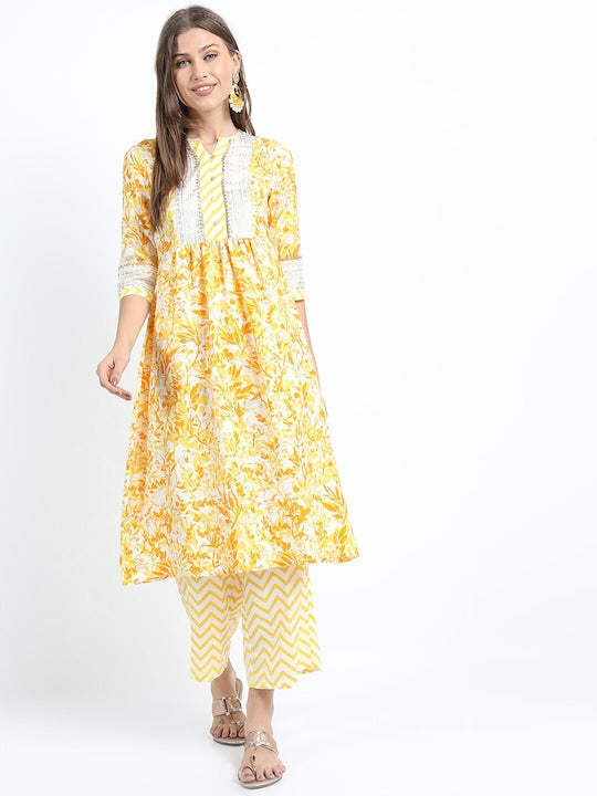 Vishudh Women Mustard Yellow & White Floral Printed Kurta with Palazzos