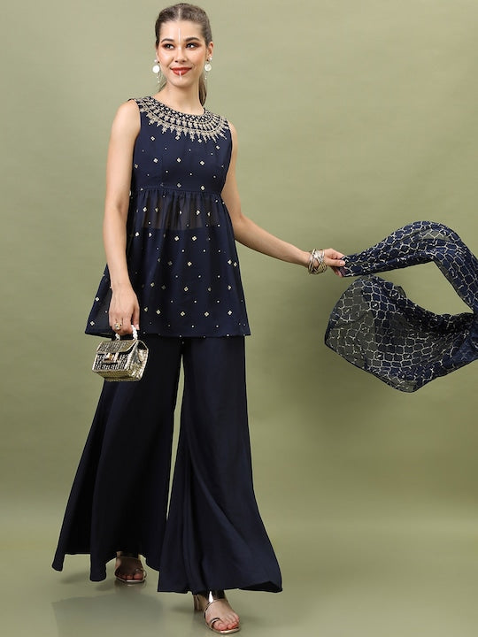 Vishudh Women Navy Blue Ethnic Motifs Embroidered Empire Kurti with Palazzos & With Dupatta