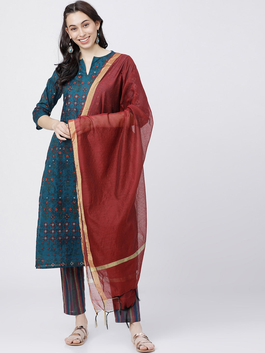 Vishudh Women Teal Printed Kurta with Palazzo and Dupatta