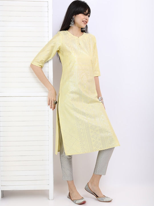 Vishudh Women Yellow & Silver-Toned Printed Keyhole Neck Straight Kurta